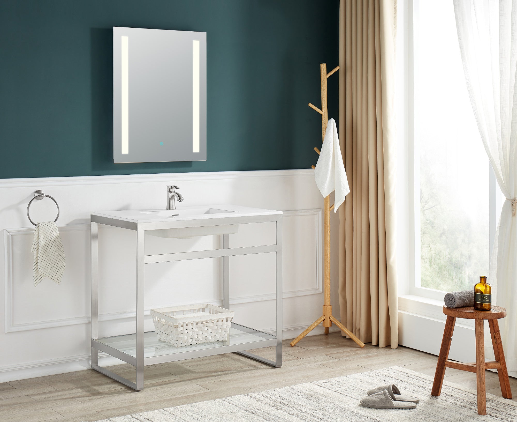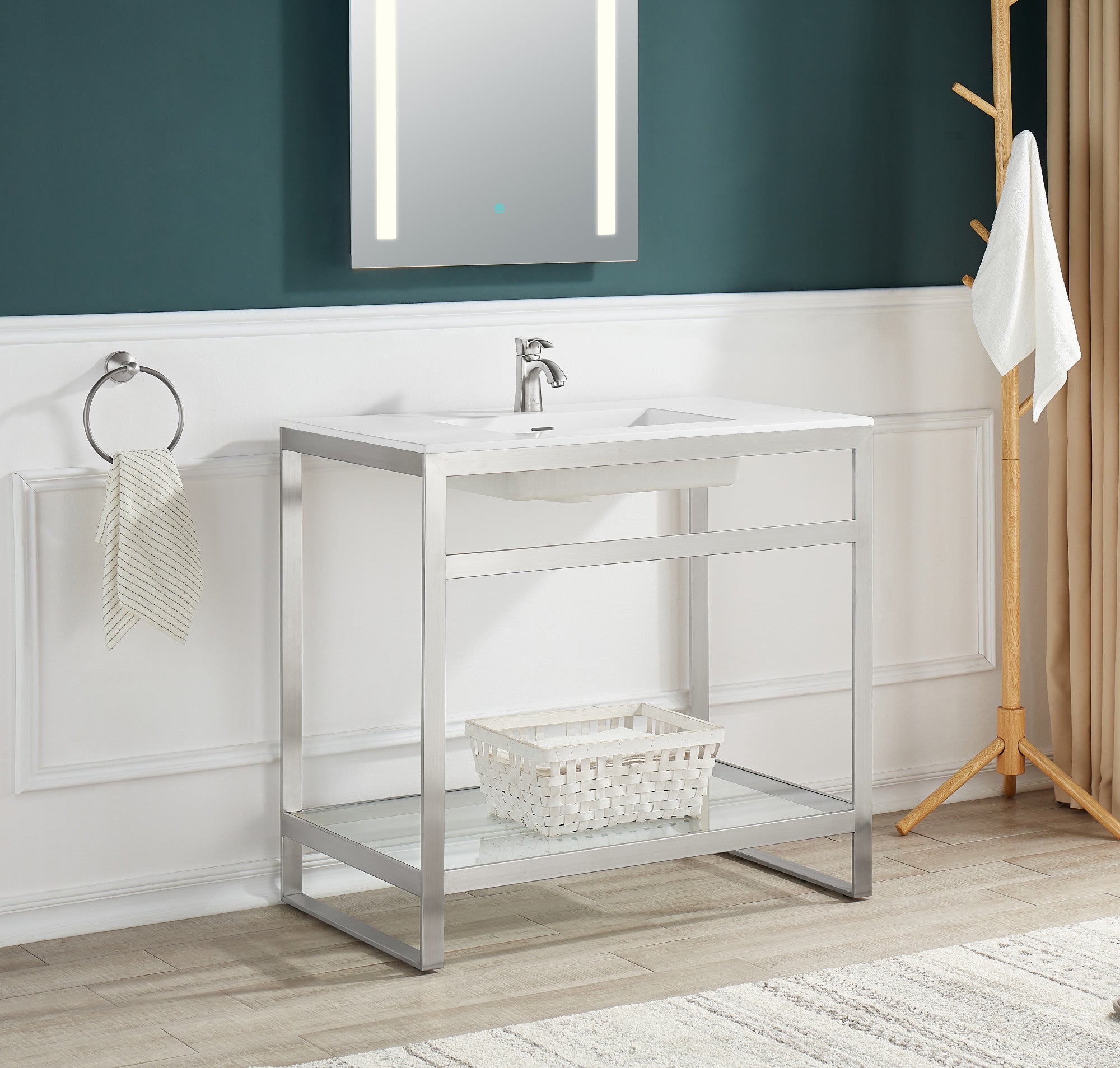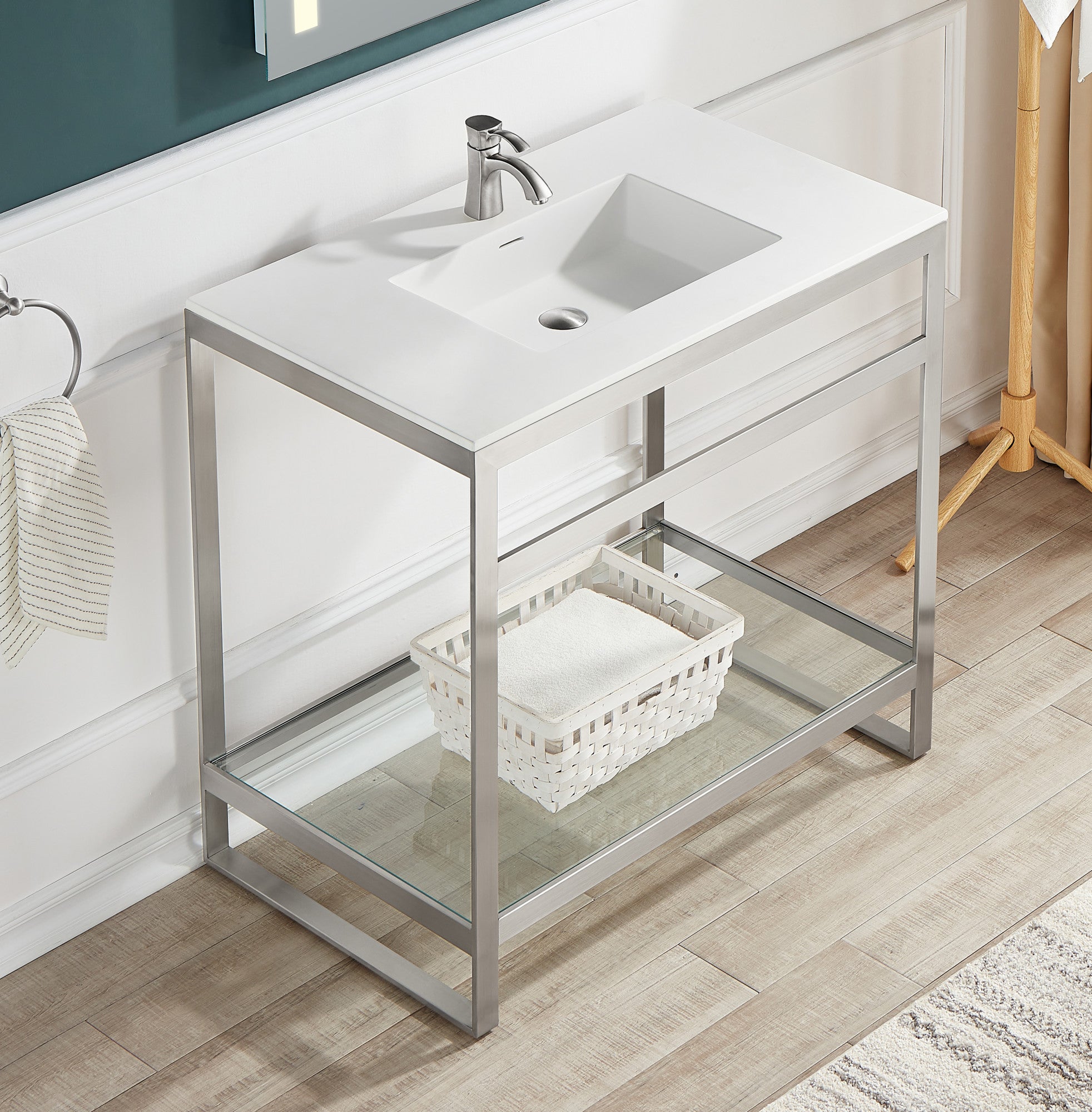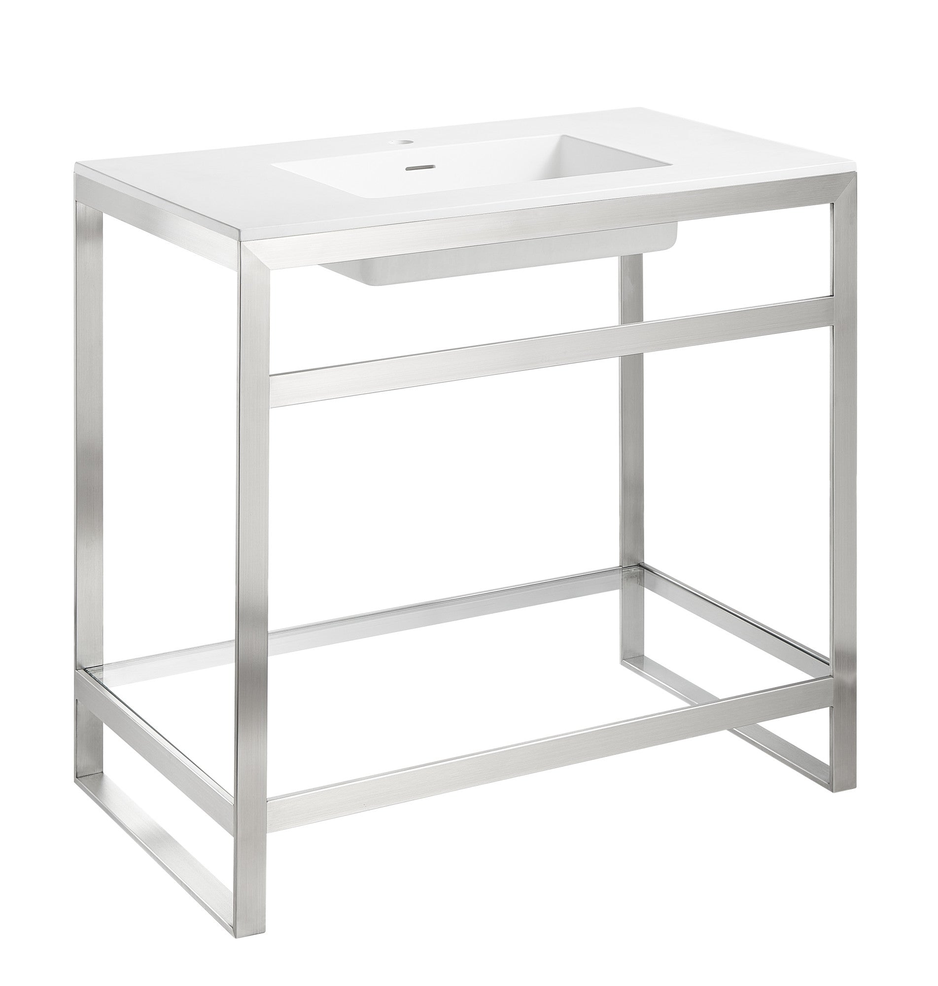 Fresh and forward thinking, this ultramodern bathroom update breaks away from the everyday with its avant-garde styling and angular sensibility. The handsome stainless steel frame is rust resistant, finished in striking Brushed Nickel, and topped with a gel-coated Glossy White sink crafted from man-made stone. Includes a tempered glass bottom panel that creates a cute creative space for accent pieces or accessories.
