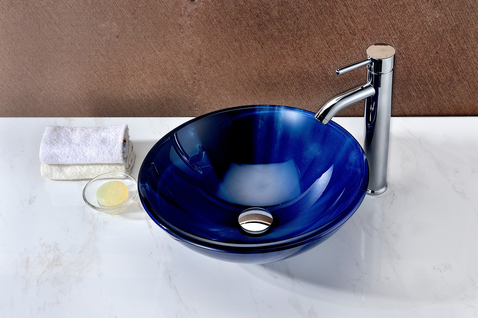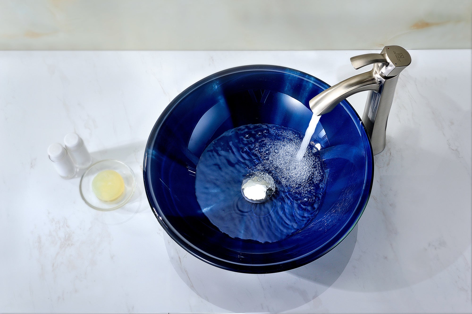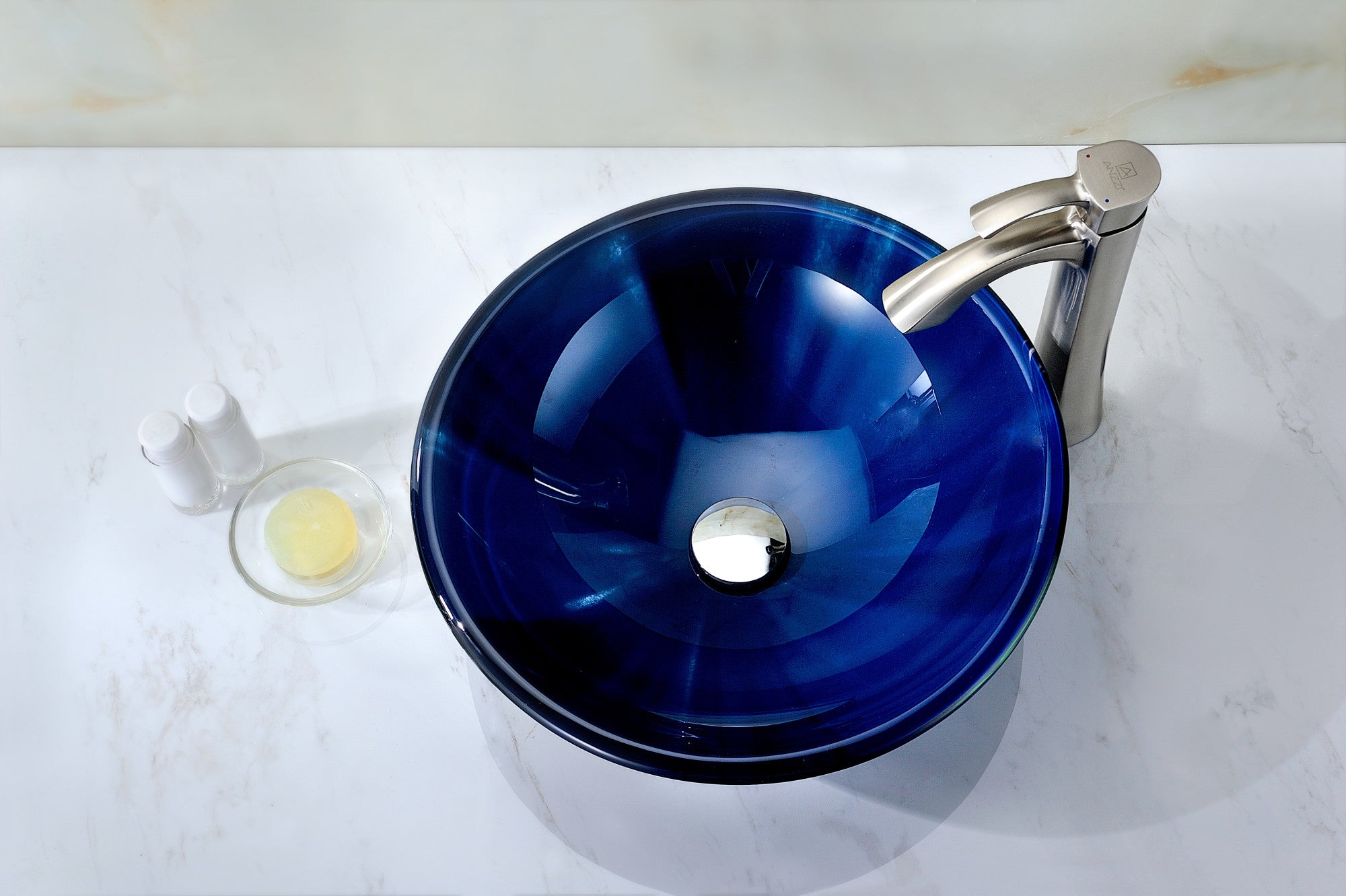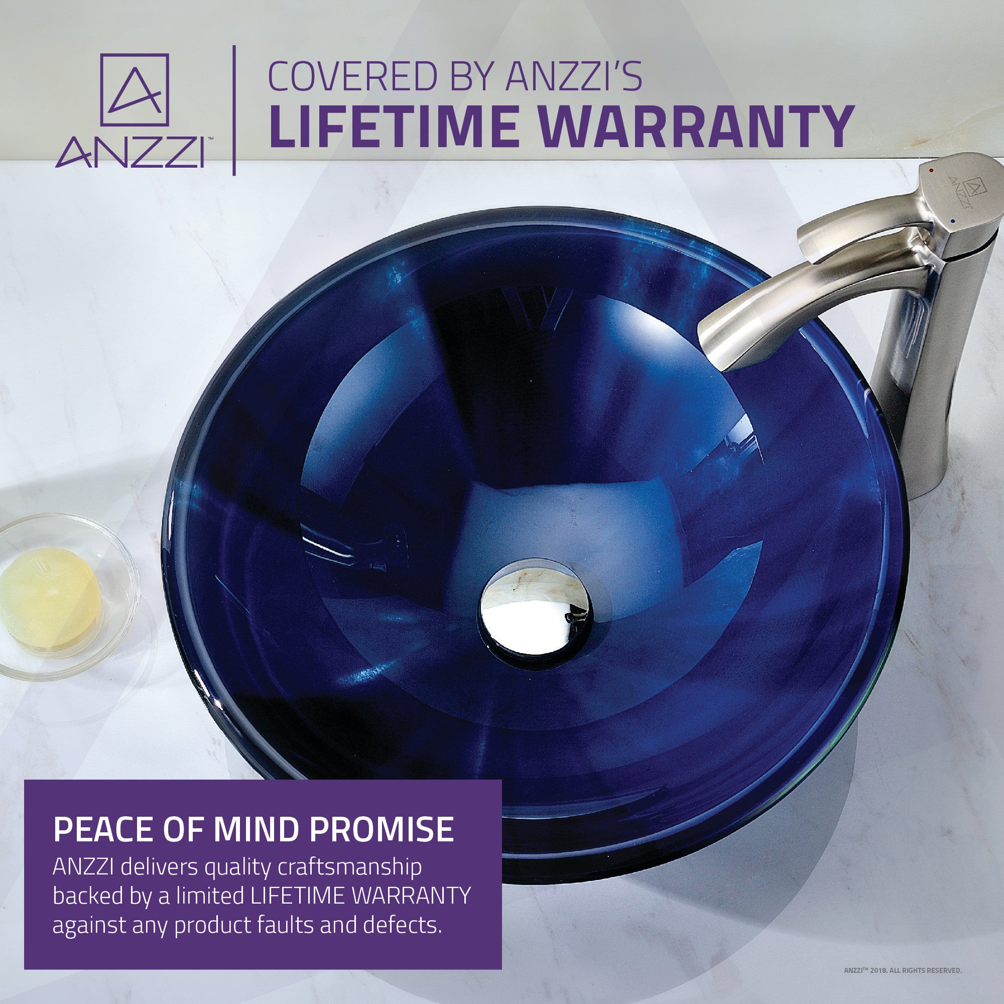 The ANZZI Meno Series sink is a traditionally crafted round vessel sink adorned in a Lustrous Blue Finish. Each ANZZI vessel sink is formed using RHINO ALLOY certified high tempered Deco-Glass material. The result is a dynamically shaped and captivating vessel centerpiece for any bathroom counter.