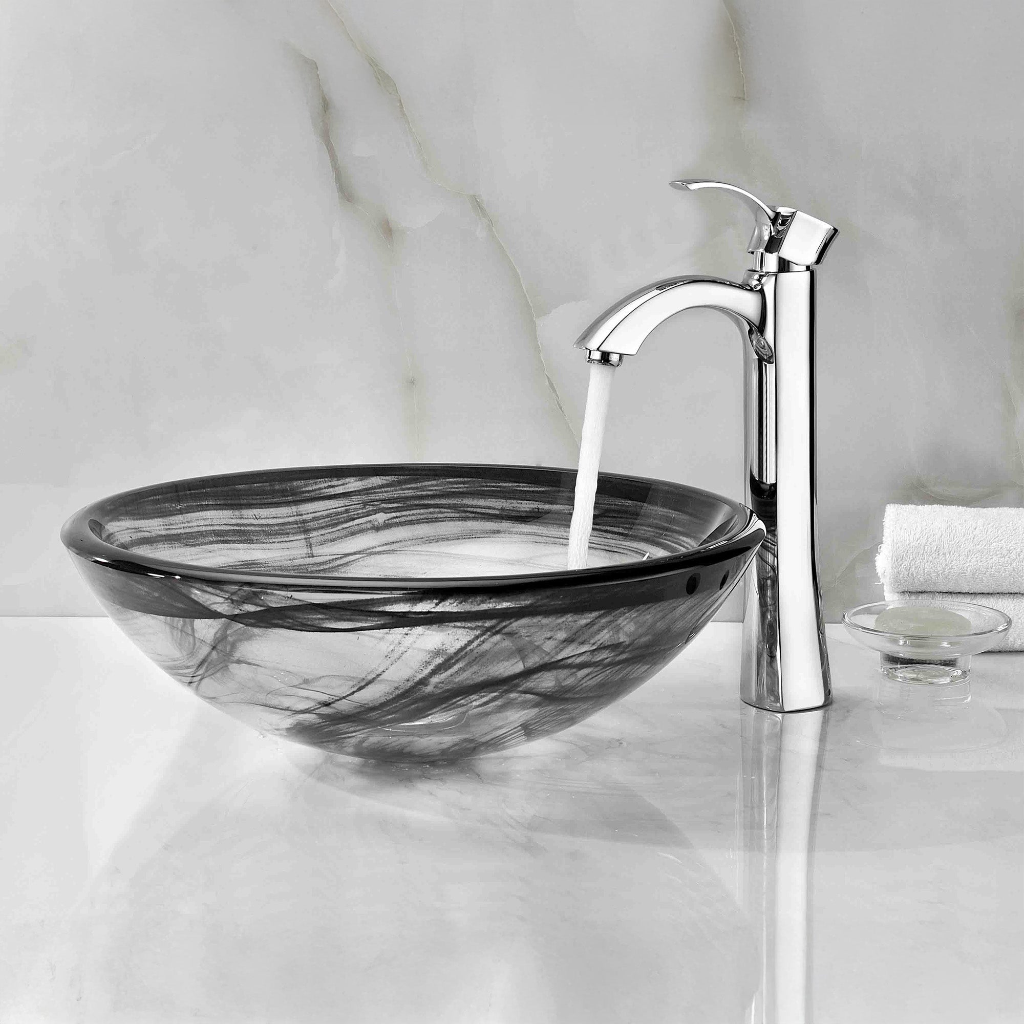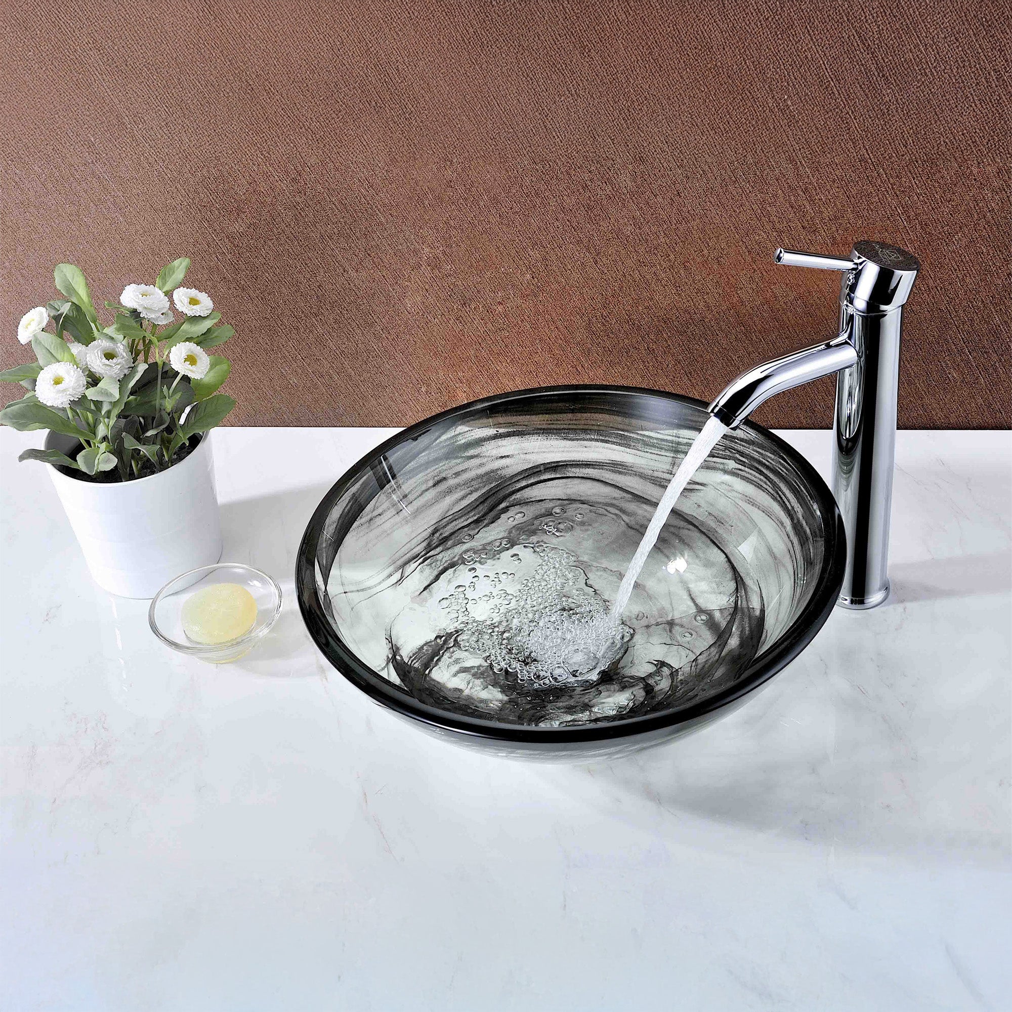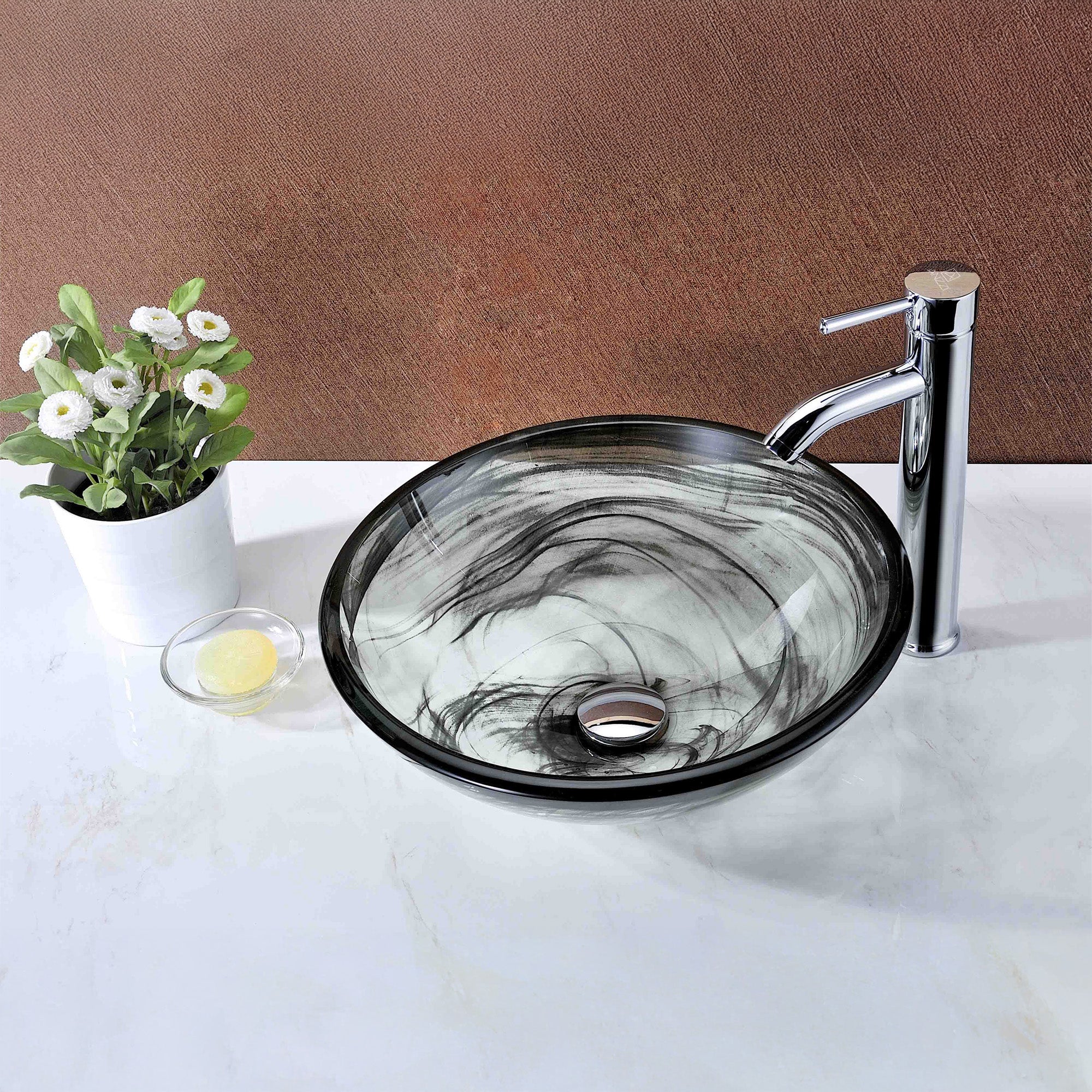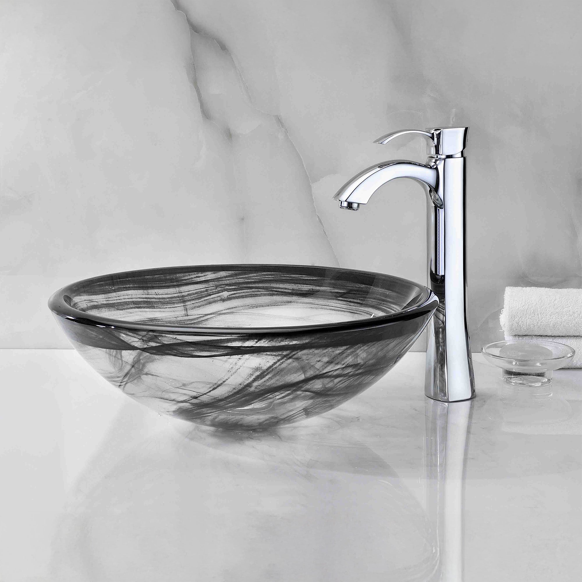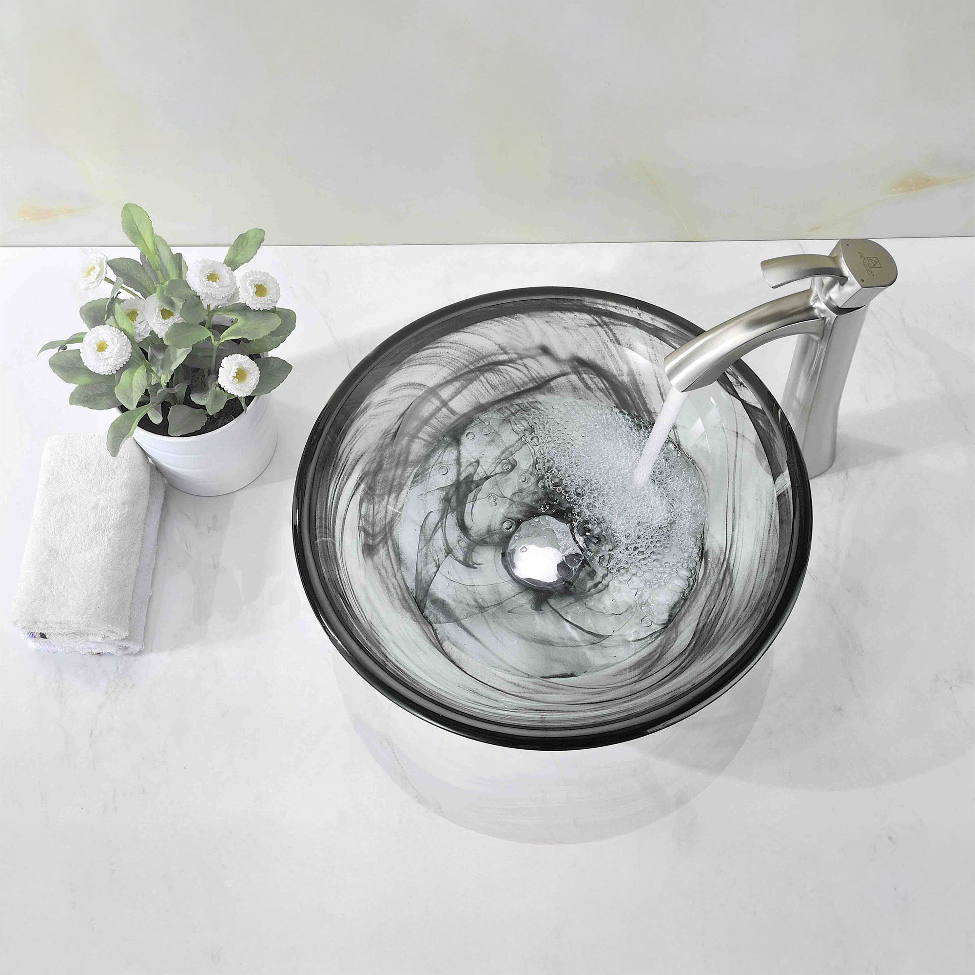 The ANZZI Mezzo Series sink is a traditionally crafted round vessel sink adorned in slumber wisp finish. Each ANZZI vessel sink is formed using RHINO ALLOY certified high tempered Deco-Glass material. The result is a dynamically shaped and captivating vessel centerpiece for any bathroom counter.