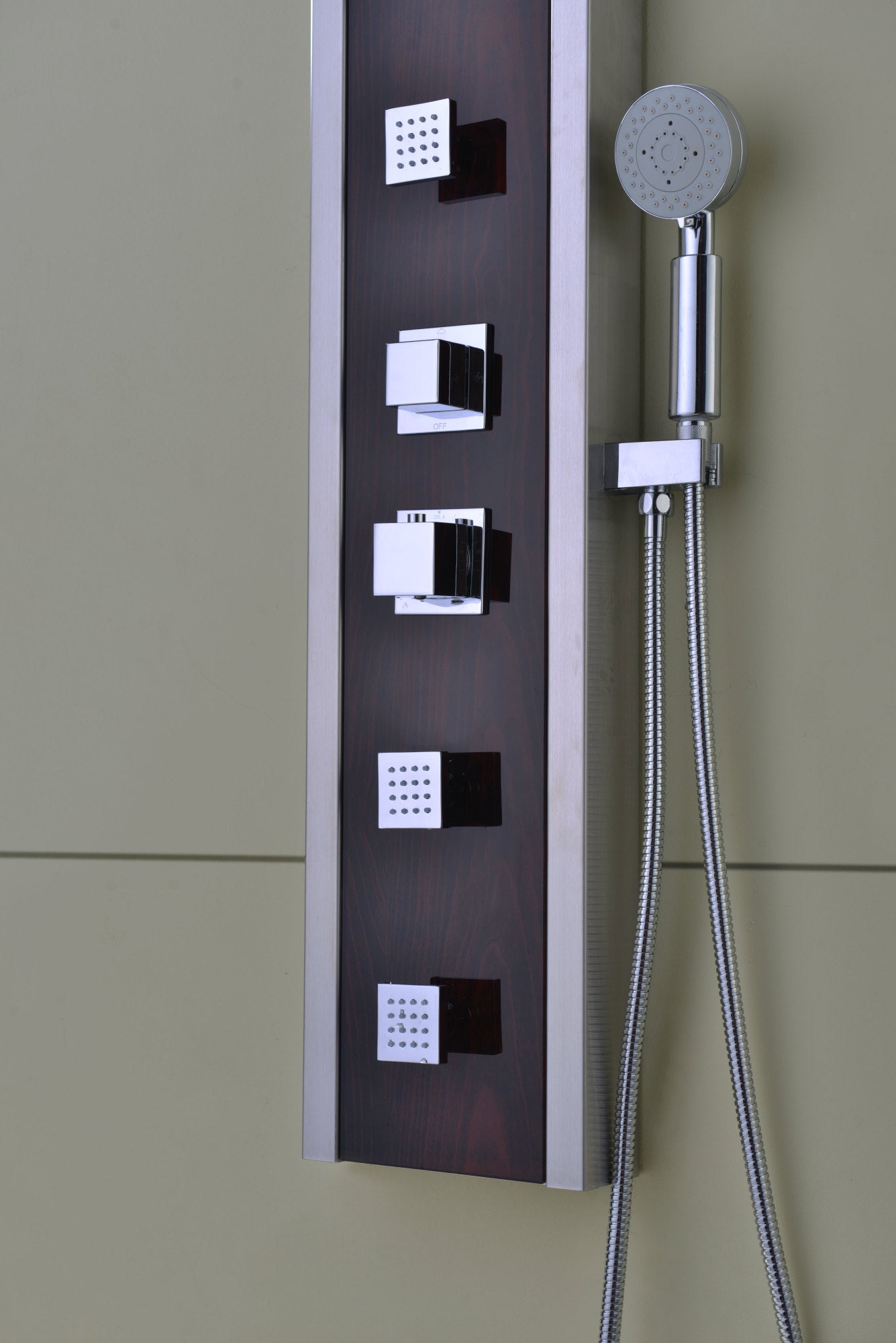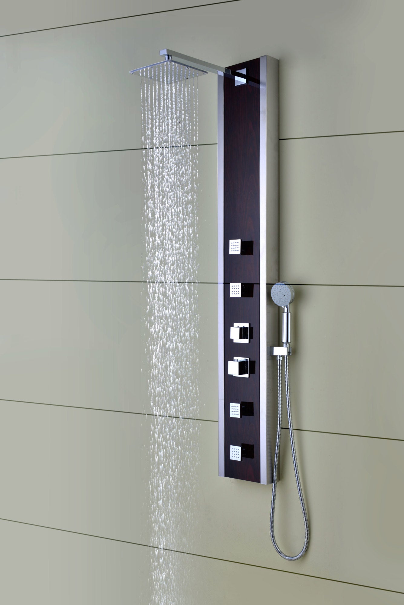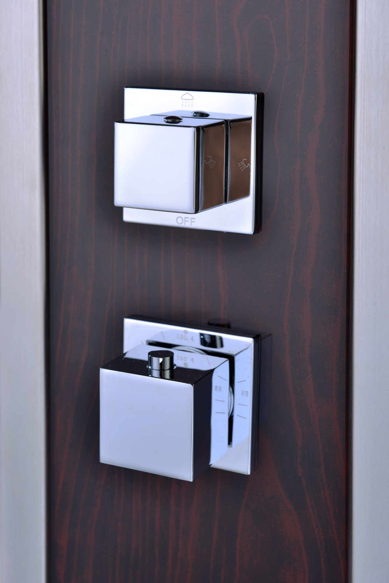 ANZZI’s Full Body Monsoon Shower Panel features hard edged 90 degree modernist angles with a rich Mahogany finish protected by a Tempered Deco-Glass facing and accented with polished chrome stainless steel trimming. Four polished chrome plated swiveling Acu-Stream body jets provide powerful and evenly dispersed streams to massage the body. The swiveling Heavy Rain shower head hangs overhead releasing a steady torrent of soothing water from above. And finally, always positioned at the column’s flank is the Euro-Grip hand held sprayer with free reign reach of up to 60 inches. And everything is controlled through the two polished chrome plated thermostatic and diverter knobs.