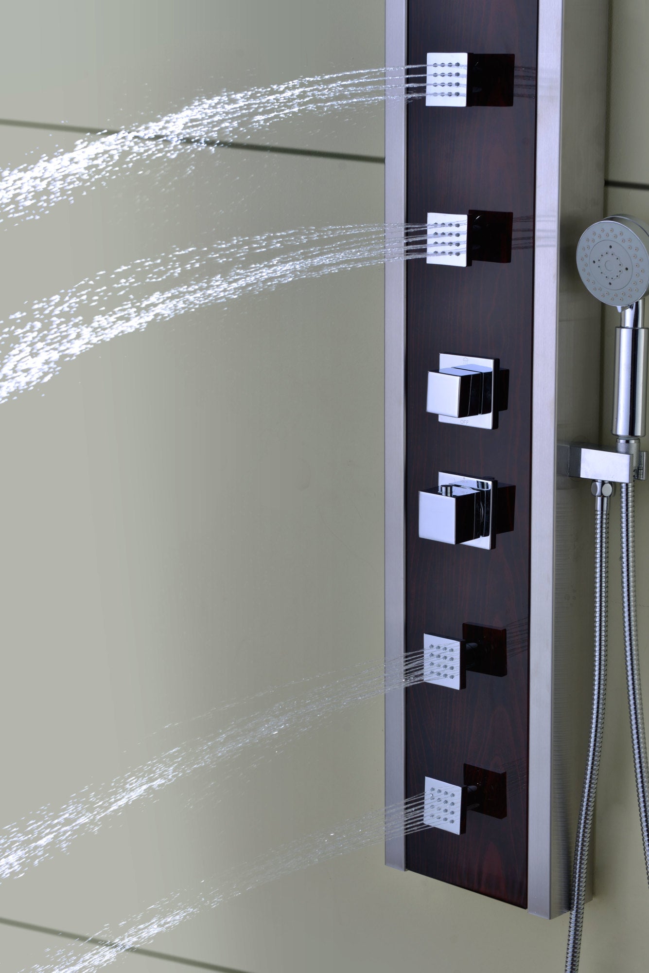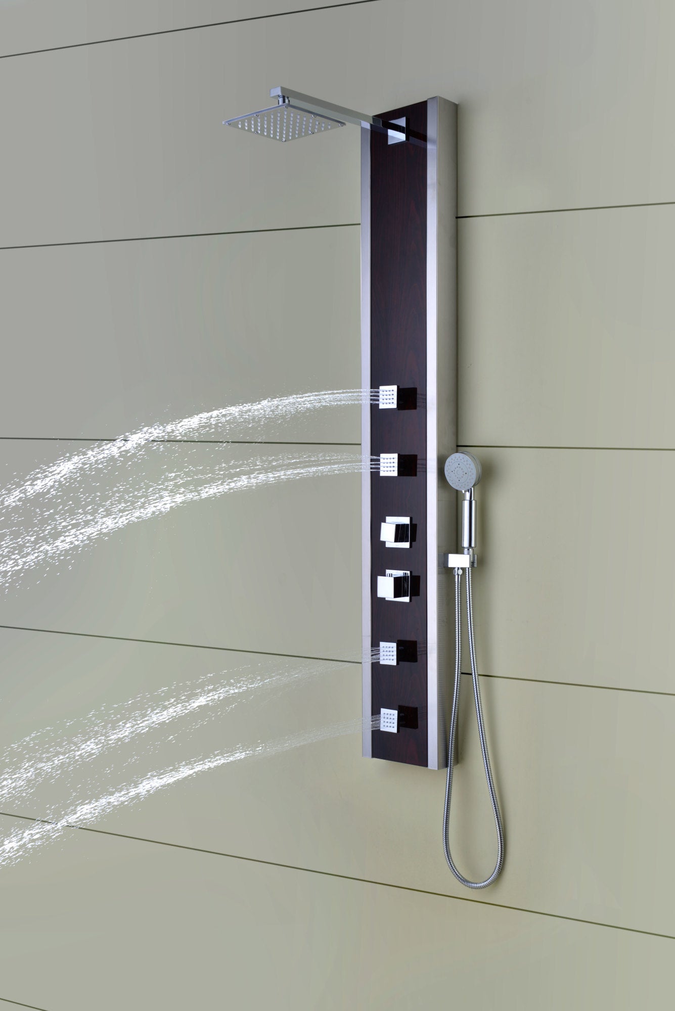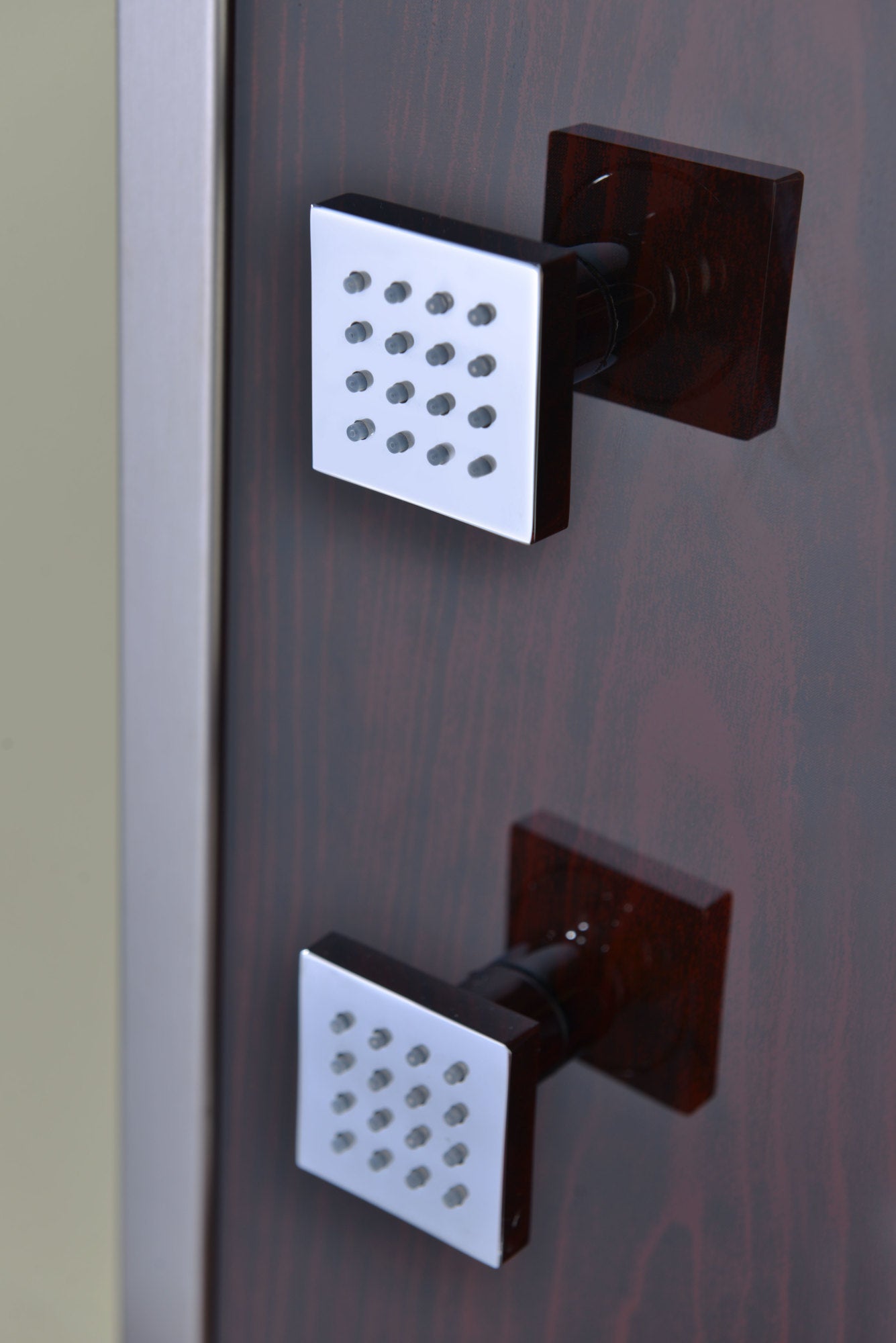 ANZZI’s Full Body Monsoon Shower Panel features hard edged 90 degree modernist angles with a rich Mahogany finish protected by a Tempered Deco-Glass facing and accented with polished chrome stainless steel trimming. Four polished chrome plated swiveling Acu-Stream body jets provide powerful and evenly dispersed streams to massage the body. The swiveling Heavy Rain shower head hangs overhead releasing a steady torrent of soothing water from above. And finally, always positioned at the column’s flank is the Euro-Grip hand held sprayer with free reign reach of up to 60 inches. And everything is controlled through the two polished chrome plated thermostatic and diverter knobs.