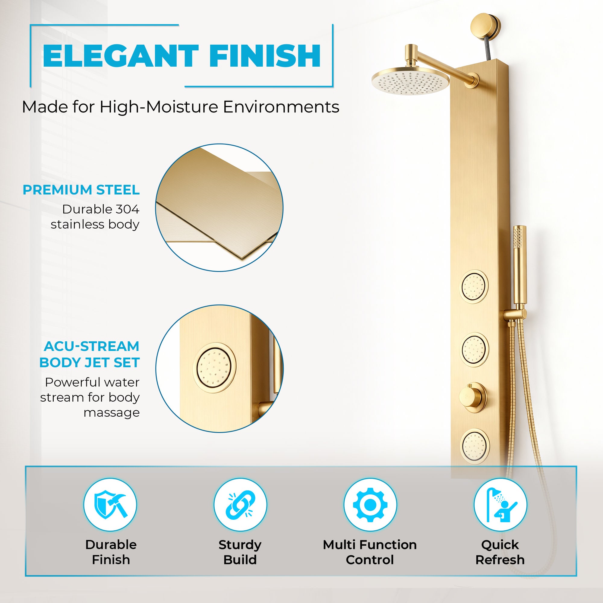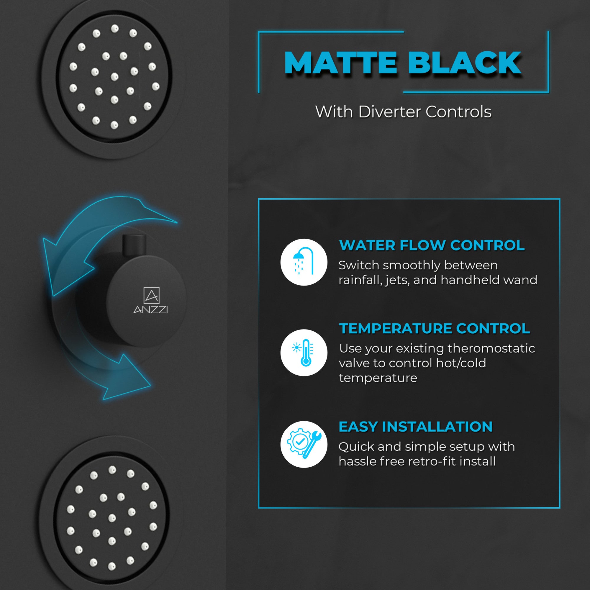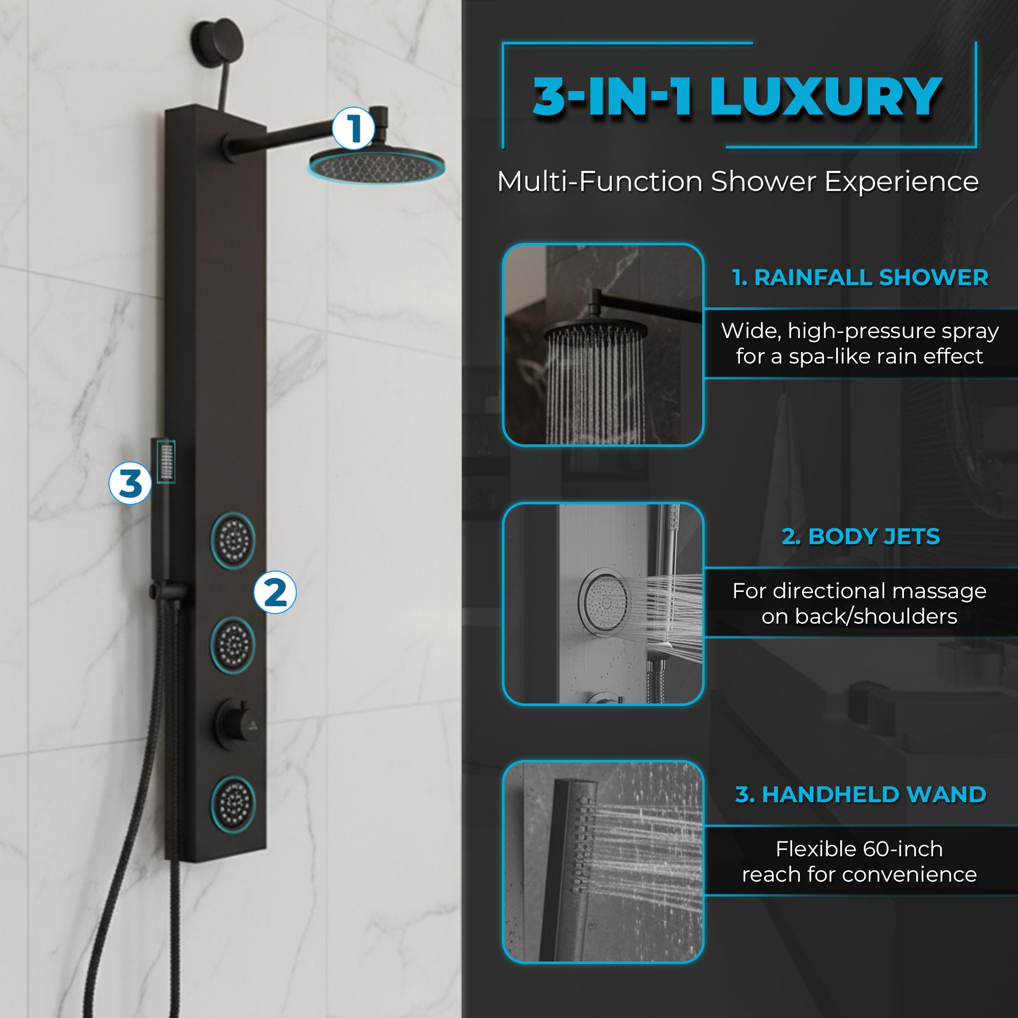 Transform your daily shower into a spa-like escape with the Beverly Series in Matte Black, Brushed Nickel and Brushed Gold. This easy-to-install upgrade uses your existing water line, eliminating the need for extensive plumbing work or wall alterations. With three Acu-Stream jets for a soothing body massage, a Heavy Rain shower head that cascades water from above, and a Euro-Grip handheld sprayer with a 60-inch reach, the Beverly Series combines elegance and functionality to redefine your shower experience.