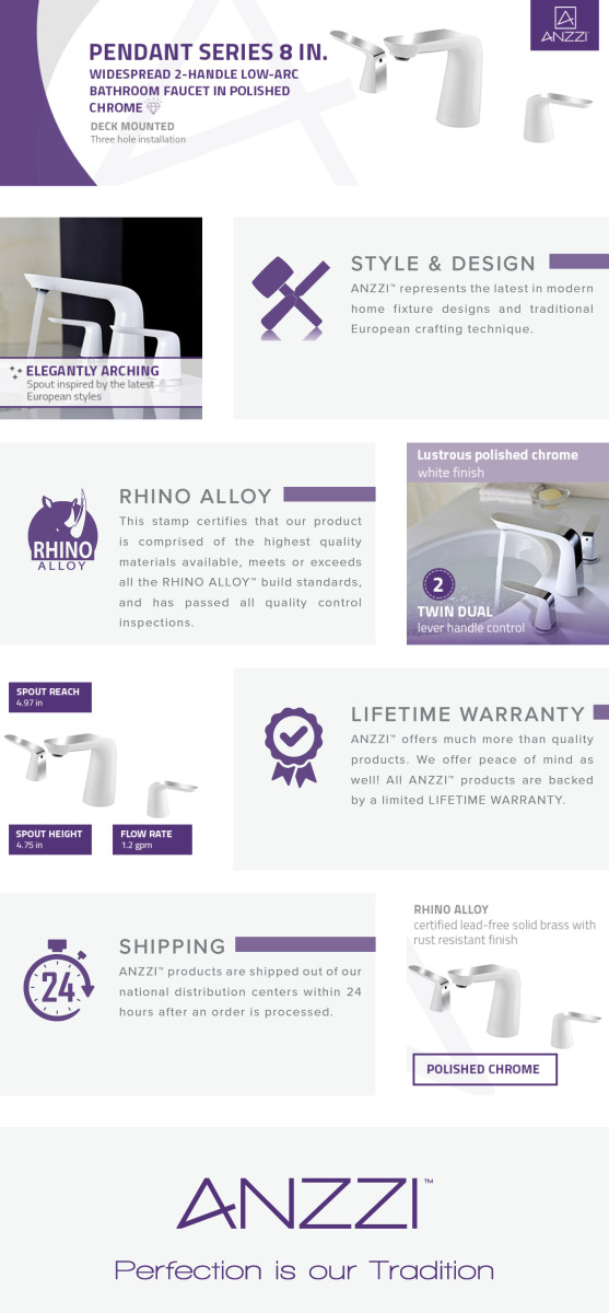 ANZZI is committed to introducing the latest in European bath fixture design to the North American home. ANZZI presents the Pendant Series 2-Handles Bathroom Sink Faucet. Crafted using lead-free RHINO ALLOY certified brass as the interior and our Lustrous Polished Chrome and White rust resistant finish. This all metal combination of high quality materials ensures you will enjoy a flawlessly performing faucet for many years to come. The elegantly simple dual handle design allows for complete and easy control of both water flow and temperature while maintain the fine minimalist aesthetic to match with any modern or contemporary décor style. The ANZZI Pendant Series is listed certified under cUPC, NSF, AB1953, Watersense, ADA for installation within North America.