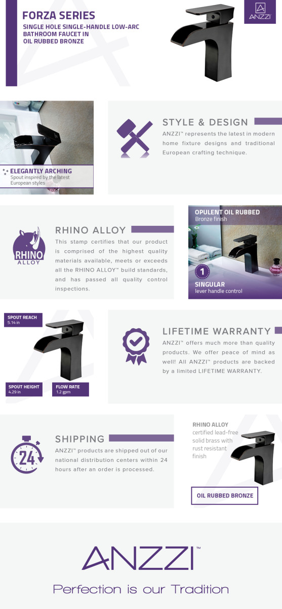 ANZZI is committed to introducing the latest in European bath fixture design to the North American home. ANZZI presents the Forza Series Single Handle Bathroom Sink Faucet. Crafted using lead-free RHINO ALLOY certified brass as the interior and our Opulent Oil Rubbed Bronze rust resistant finish. This all metal combination of high quality materials ensures you will enjoy a flawlessly performing faucet for many years to come. The deceptively simple single handle design allows for complete and easy control of both water flow and temperature while maintain the fine minimalist aesthetic to match with any modern or contemporary décor style. The ANZZI Forza Series is listed certified under cUPC, NSF, AB1953, Watersense for installation within North America.