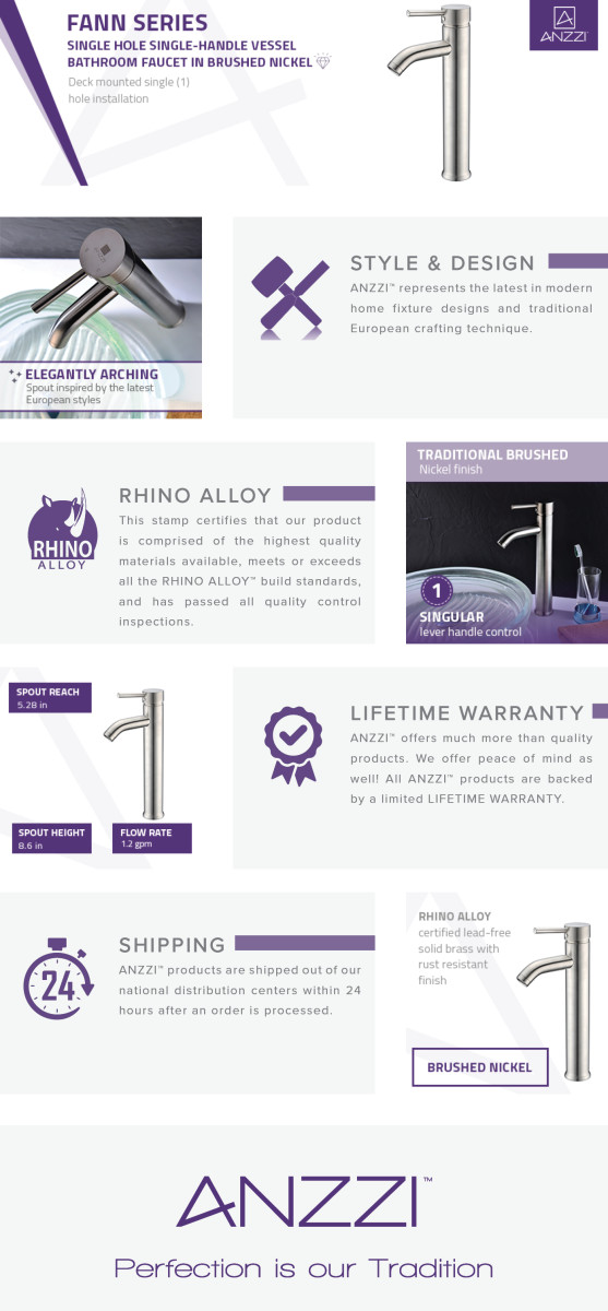 ANZZI is committed to introducing the latest in European bath fixture design to the North American home. ANZZI presents the Fann Single Handle Vessel Sink Faucet. Crafted using lead-free RHINO ALLOY certified brass as the interior and our Lustrous Brushed Nickel rust resistant finish. This all metal combination of high quality materials ensures you will enjoy a flawlessly performing faucet for many years to come. The deceptively simple single handle design allows for complete and easy control of both water flow and temperature while maintain the fine minimalist aesthetic to match with any modern or contemporary décor style. The ANZZI Fann is listed certified under CUPC, AB 1953, NSF, Water Sense for installation within North America.