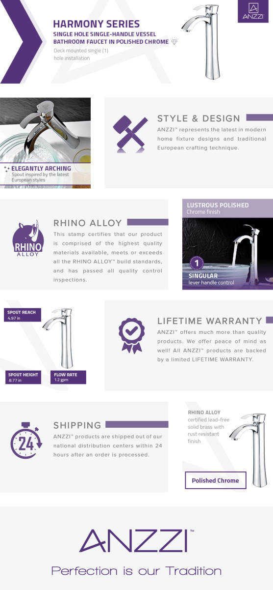 ANZZI is committed to introducing the latest in European bath fixture design to the North American home. ANZZI presents the Harmony Series Single Handle Vessel Sink Faucet. Crafted using lead-free RHINO ALLOY certified brass as the interior and our Lustrous Polished Chrome rust resistant finish. This all metal combination of high quality materials ensures you will enjoy a flawlessly performing faucet for many years to come. The deceptively simple single handle design allows for complete and easy control of both water flow and temperature while maintain the fine minimalist aesthetic to match with any modern or contemporary décor style. The ANZZI Harmony Series is listed certified under cUPC, NSF, AB1953, Watersense for installation within North America.