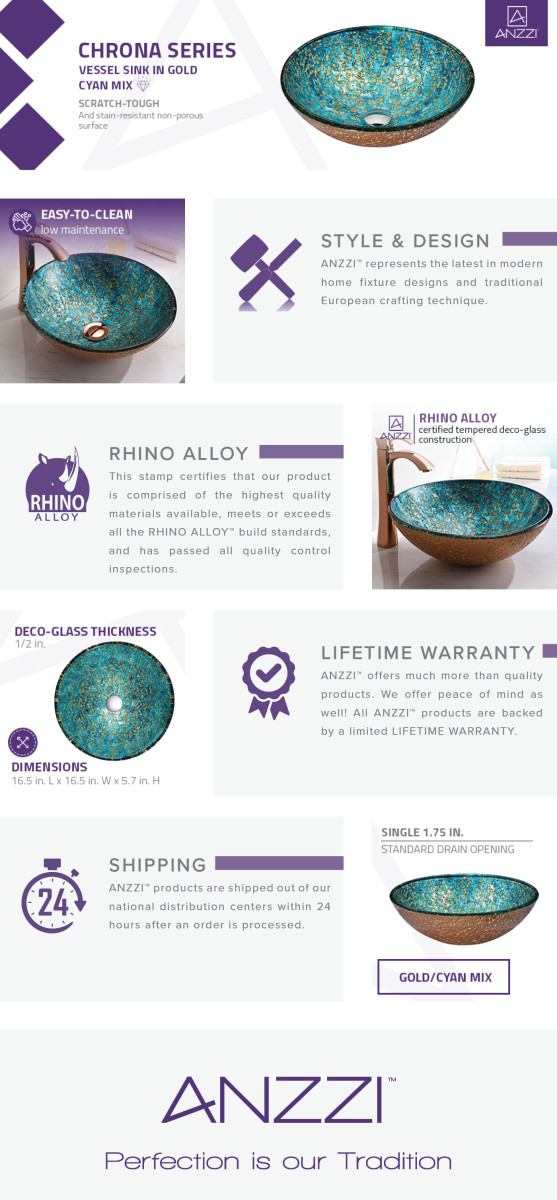 The ANZZI Chrona Series sink is a traditionally crafted round vessel sink adorned in a Gold/Cyan Mix finish. Each ANZZI vessel sink is formed using RHINO ALLOY certified high tempered Deco-Glass material. The result is an elegantly shaped and captivating vessel centerpiece for any bathroom counter.RHINO ALLOY certified tempered deco-glass construction in a stunning Gold/Cyan Mix finish