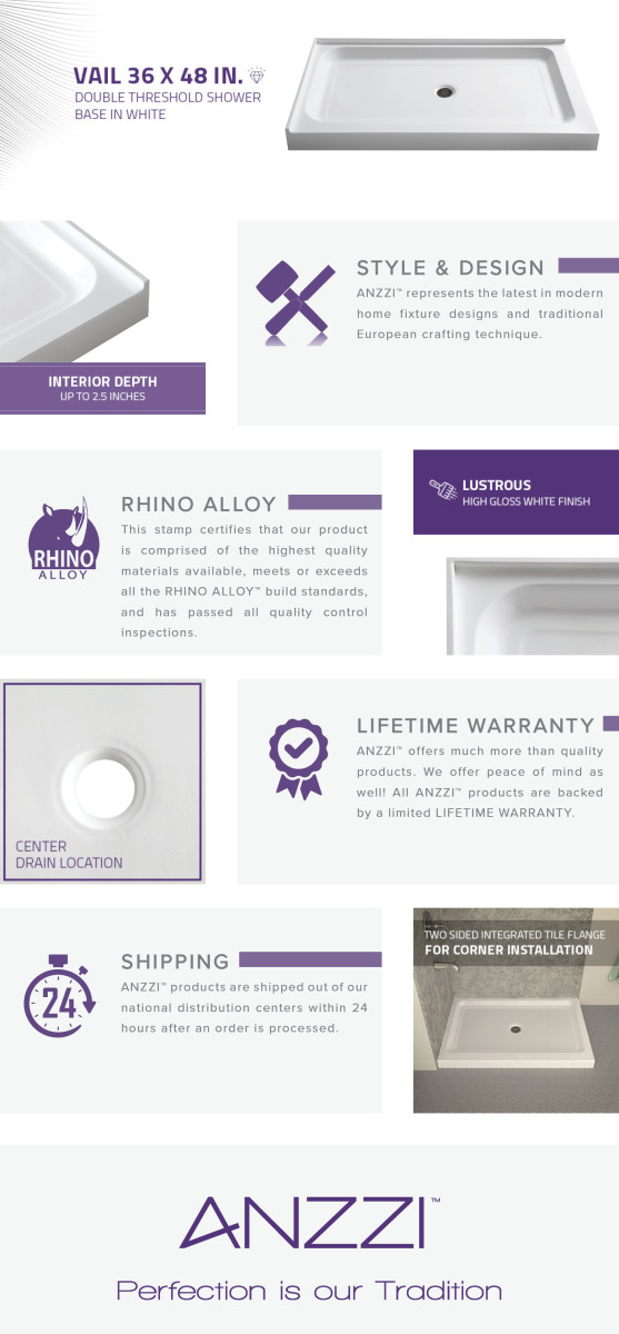 Trust ANZZI to provide the perfect foundation for your new dream shower. ANZZI shower bases are legendary for their durable resilience and high performance reliability. ANZZI craftsman use only RHINO ALLOY certified materials such as marine grade acrylic and high yield fiberglass to deliver a durable and stylish shower base unit. The glossy evenly coated finish is a striking eye catcher which compliments and enhances any style of bathroom.Overall dimensions: 48 in. W x 36 in. D x 5.5 in. H