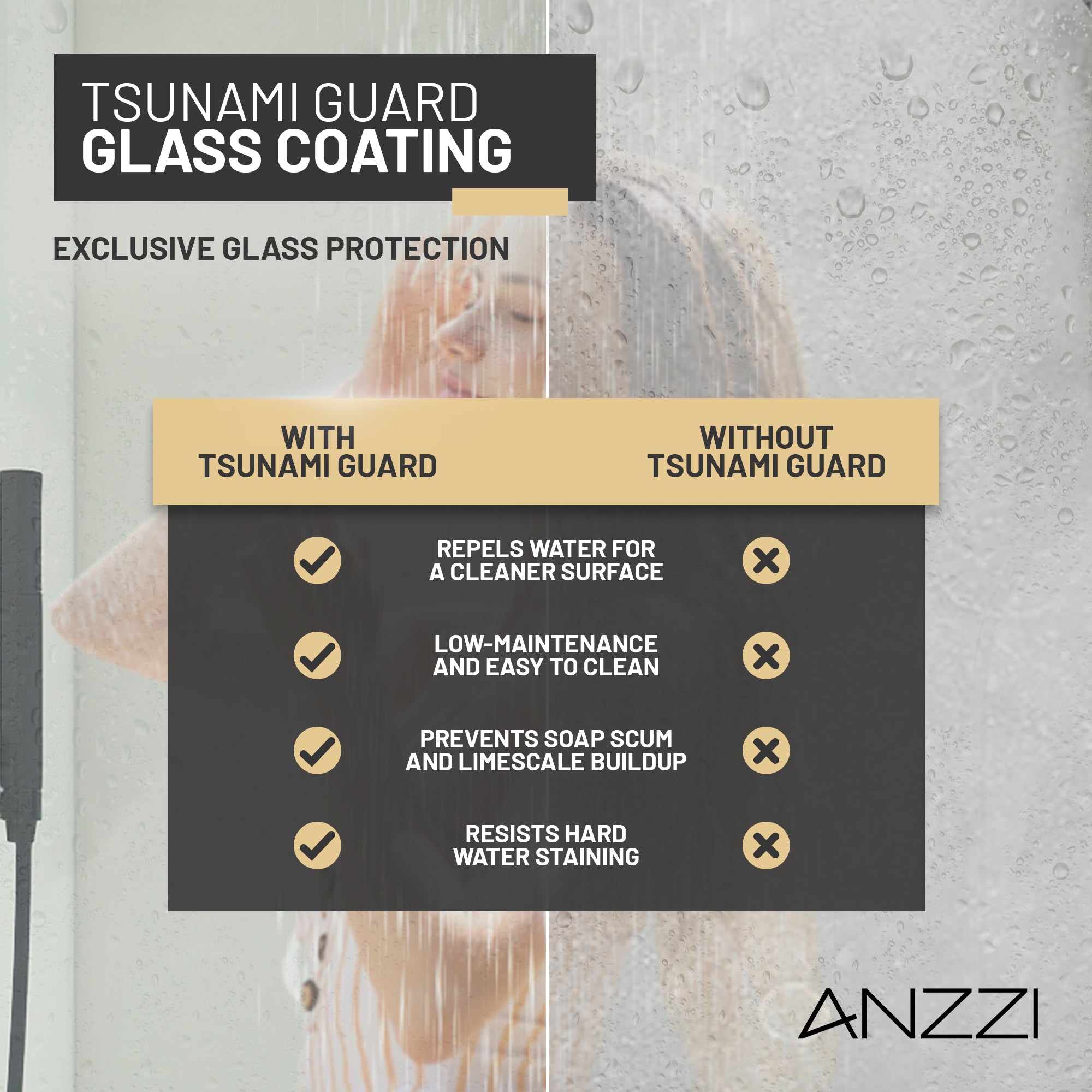 TSUNAMI GUARD PROTECTION: Water-repellent tsunami guard-coated glass protects against water stains, lime scale, and soap scum.