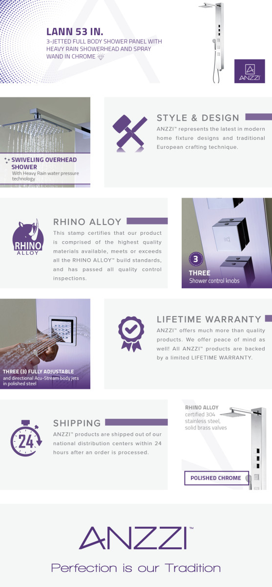 Start your day refreshed and invigorated thanks to the massaging power of a full-body shower. The ANZZI Lann shower panel features a laser cut stainless steel body that brings an air of ultramodern elegance to your bathroom space. The three swiveling Acu-Stream body jets, swiveling Heavy Rain showerhead and polished steel Euro-Grip hand sprayer let you create your own unique shower experience. Four easy-to-reach knobs make it simple to operate.Crafted from laser cut, precision shaped stainless steel