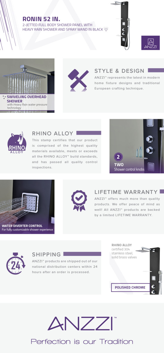 The ANZZI Full Body Ronin Shower Panel features 90 degree modernist angles defining the modest steel body in a black finish. Two polished chrome plated swiveling Acu-Stream body jets provide powerful and evenly dispersed streams to massage the body. The swiveling Heavy Rain shower head hangs overhead releasing a steady torrent of soothing water from above. And finally, always positioned at the column's flank is the Euro-Grip hand held sprayer with free reign reach of up to 60 inches. And everything is controlled through the two polished chrome plated thermostatic and diverter knobs.Your order will include one (1) ANZZI RONIN Full Body Shower Panel, one (1) Heavy Rain shower head, two (2) Acu-Stream body massage jets, one (1) Euro-Grip free range hand sprayer, one (1) owner's manual