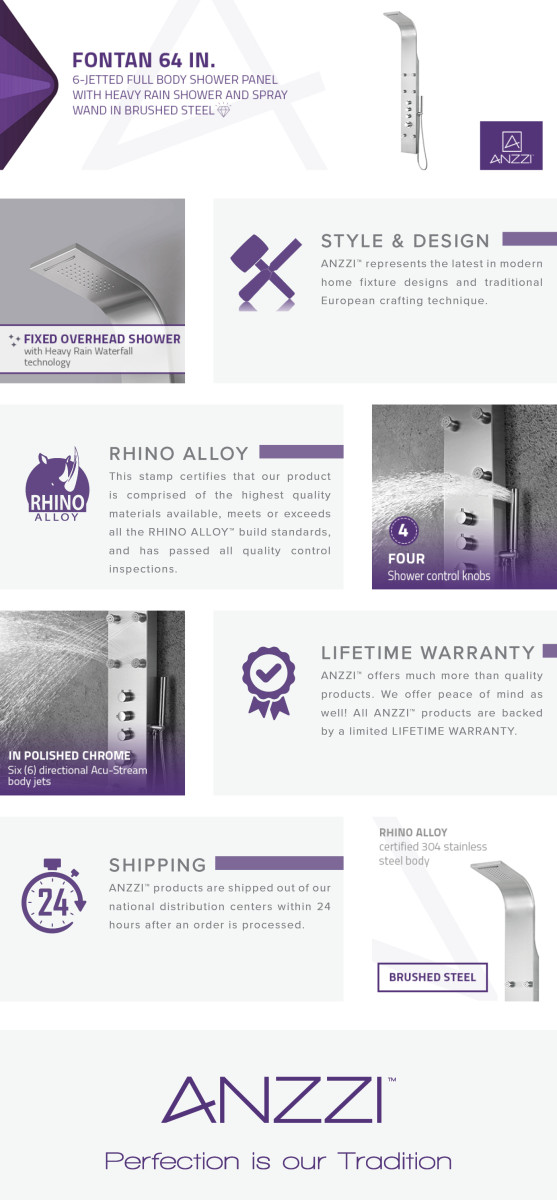 The ANZZI Full body Fontan Shower Panel features a modern laser cut stainless steel brushed body with two Acu-Stream body jets provide a relaxing yet powerful water stream to massage the body. The Heavy Rain shower head hangs overhead releasing a steady torrent of soothing water from above. And finally, always positioned at the column's flank is the brushed Euro-Grip hand held sprayer with free reign reach of up to 60 inches. And everything is controlled through four chrome thermostatic and diverter knobs.Your order will include one (1) ANZZI Fontan Full Body Shower Panel, one (1) Heavy Rain shower head, Six (6) Acu-Stream body massage jets, one (1) Euro-Grip free range hand sprayer, one (1) owner's manual