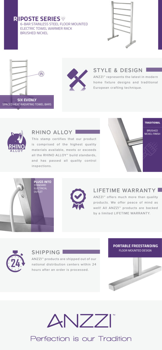 Be embraced by a warm towel after every bath with our ANZZI Riposte Series six bar floor mounted towel warmer in brushed nickel. With a modern and minimalist design our towel warmer is safe, reliable and energy efficient. No need to worry about rust as our towel warmer is finely crafted from RHINO ALLOY certified rust resistant stainless steel.Six (6) evenly spaced heat radiating towel bars